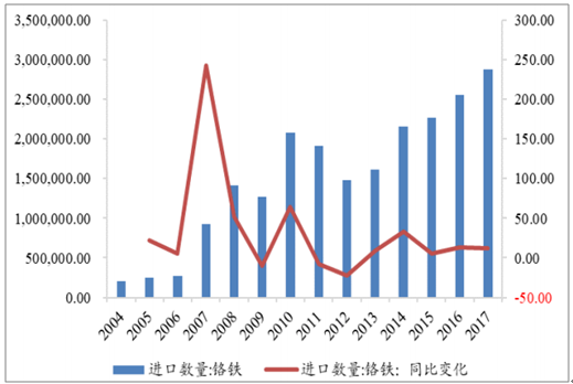 2004-2017年我國鉻鐵進口數量(噸)及其同比變化(%)
