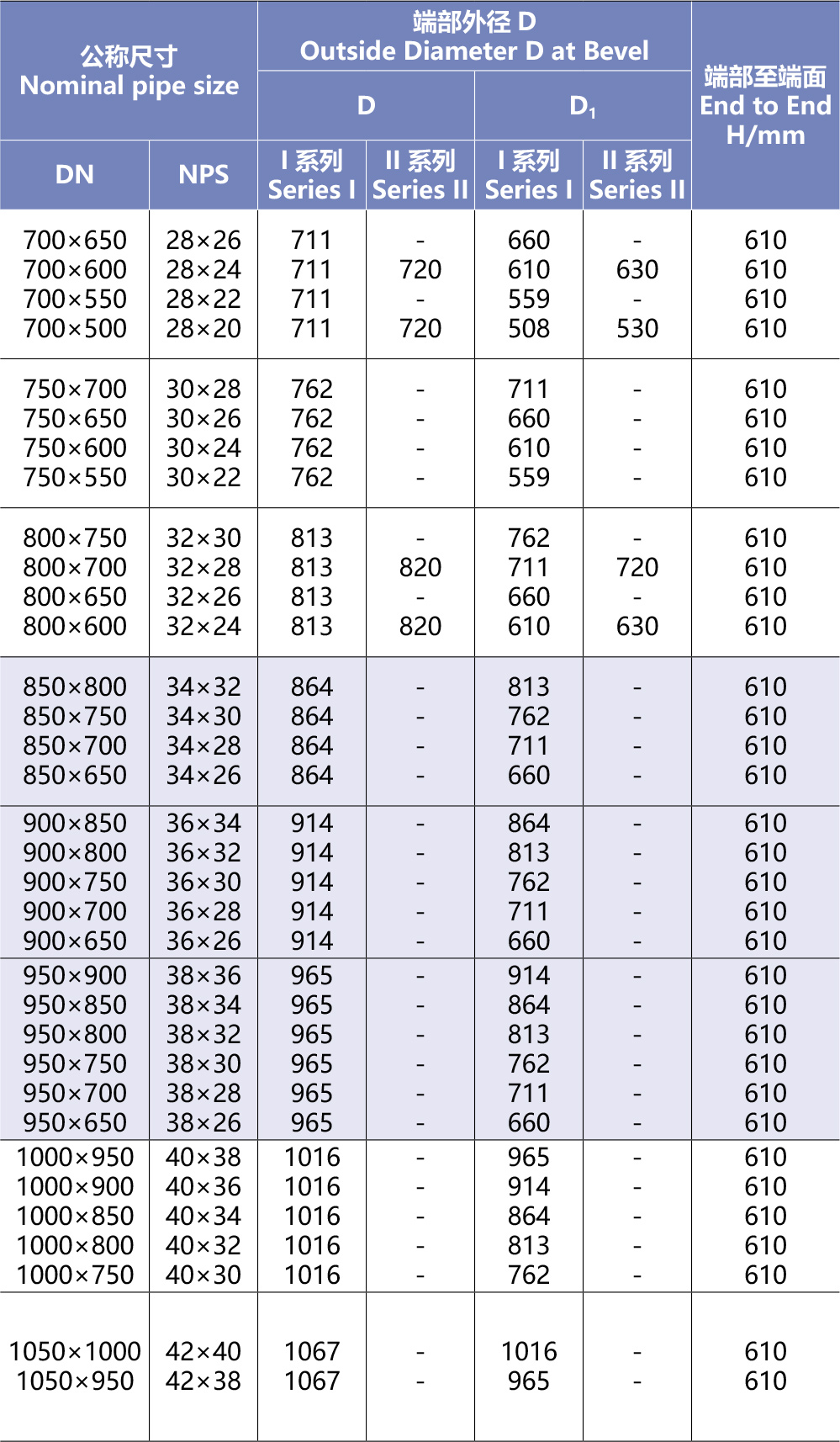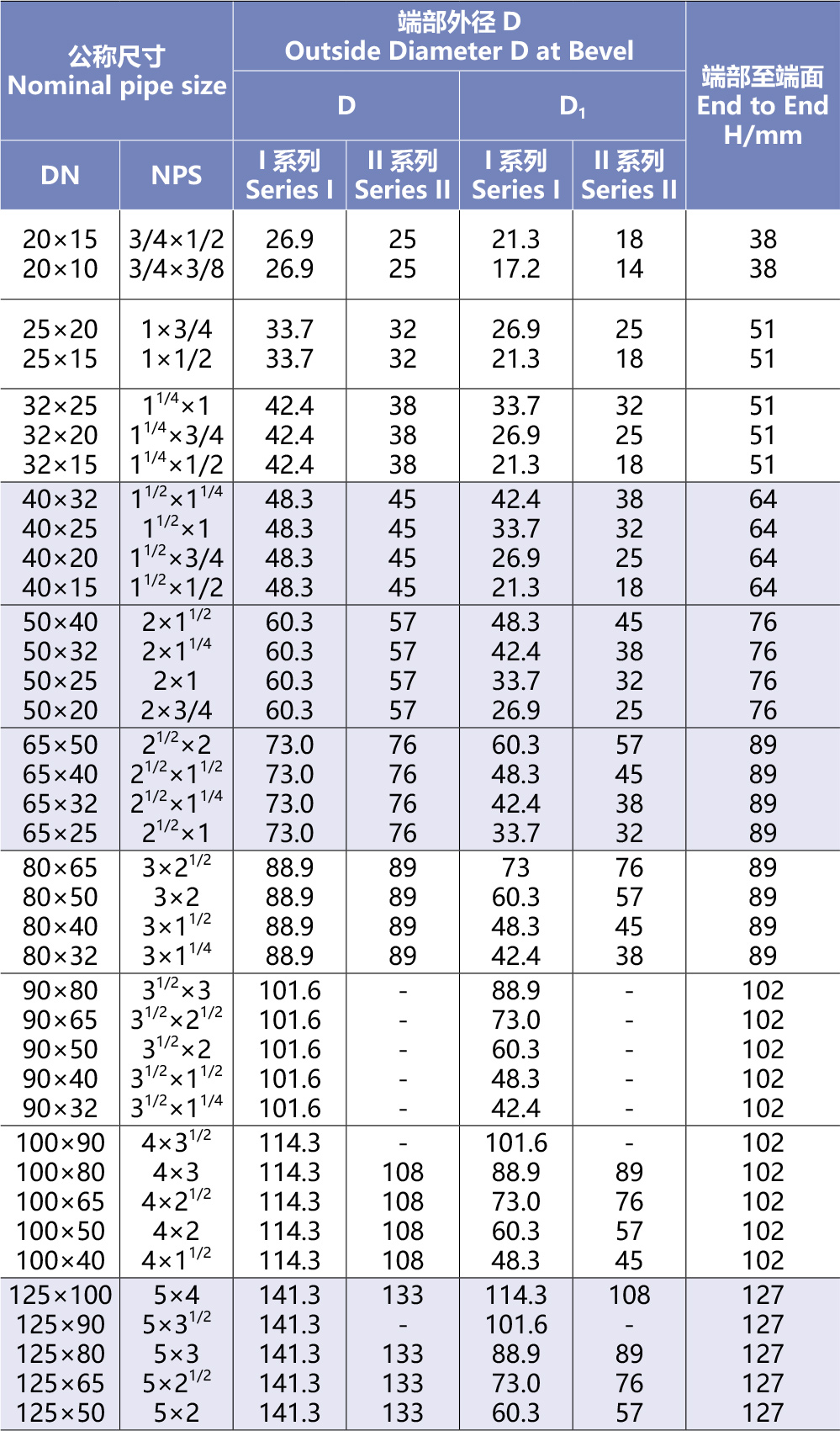 異徑管的質量應符合現行國家標準《鋼制對焊無縫管件》GB/T12459-2005及《鋼板制對焊管件》GB/T13401-2005的規定,異徑管的圓度不應大于相應端外徑的1%,且允許偏差為±3mm;異徑管尺寸允許偏差應符合表4.2.2-3的規定。異徑管的材質執行SY/T5037、GB/T9711、GB/T8163、美標ASTMA106/A53GRB,API5L、APT5CT、ASTMA105、ASTMA234、ASTMA106、DIN德國標準及客戶要求標準。